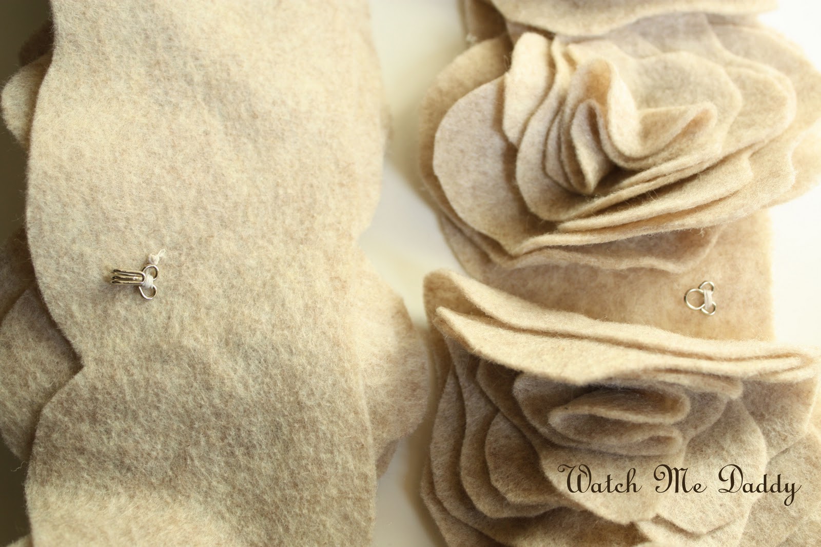 Matériel nécessaire: 1/2 mètre de 72 "de feutre ou Laine feutrée (cette mesure est d'être en sécurité ... mais vous allez vous retrouver avec un certain supplémentaire ici, c'est sûr.) Ciseaux Aiguille en coordination * option - Coller saisir rapidement Tacky ou de la colle à chaud en option * - Petit crochet et oeil Soyons commencé allons-nous? 1. Coupez tout enCommencez par couper votre pièce longue écharpe. mine était de 42 "de long par 4 1/2" de large. Vous pourriez certainement faire plus ou moins long en fonction de combien de temps vous aimez porter vos foulards. ( Vous aurez juste besoin d'ajuster le nombre de fleurs que vous faites.)